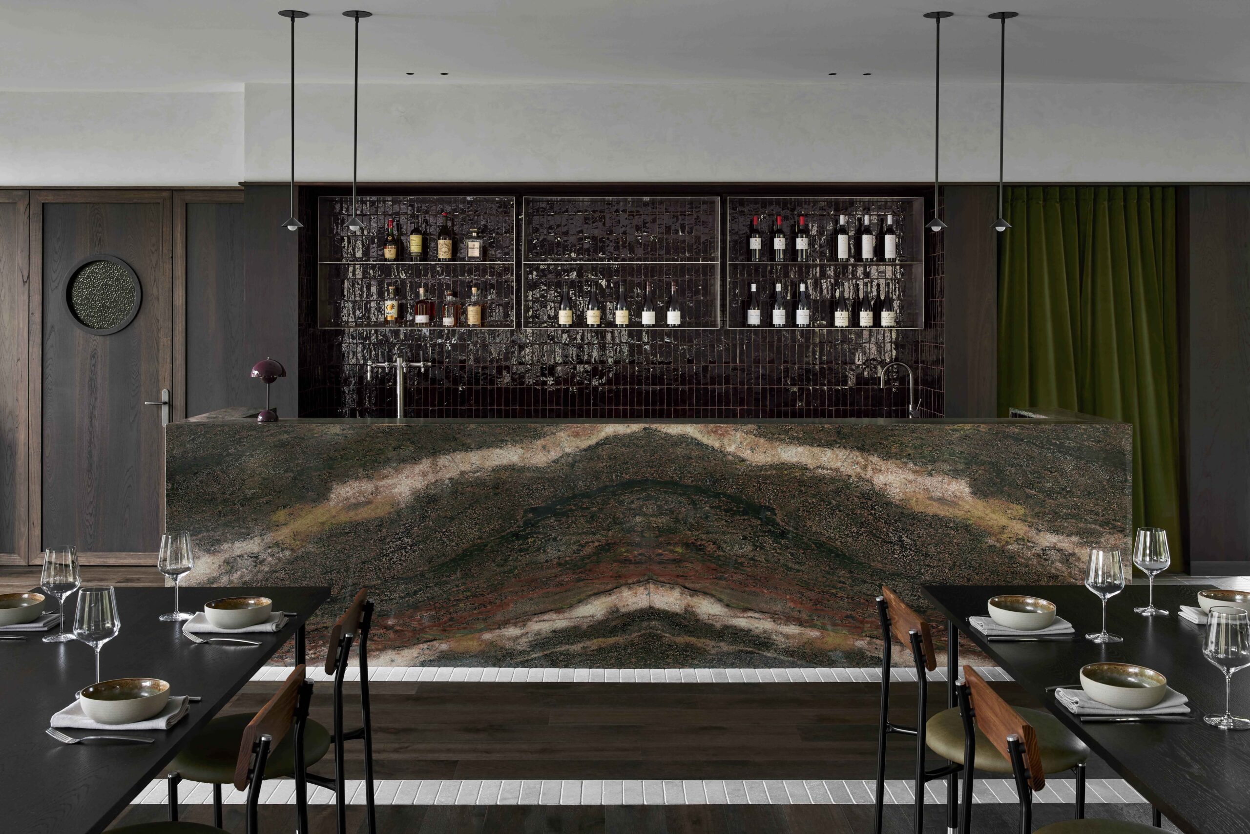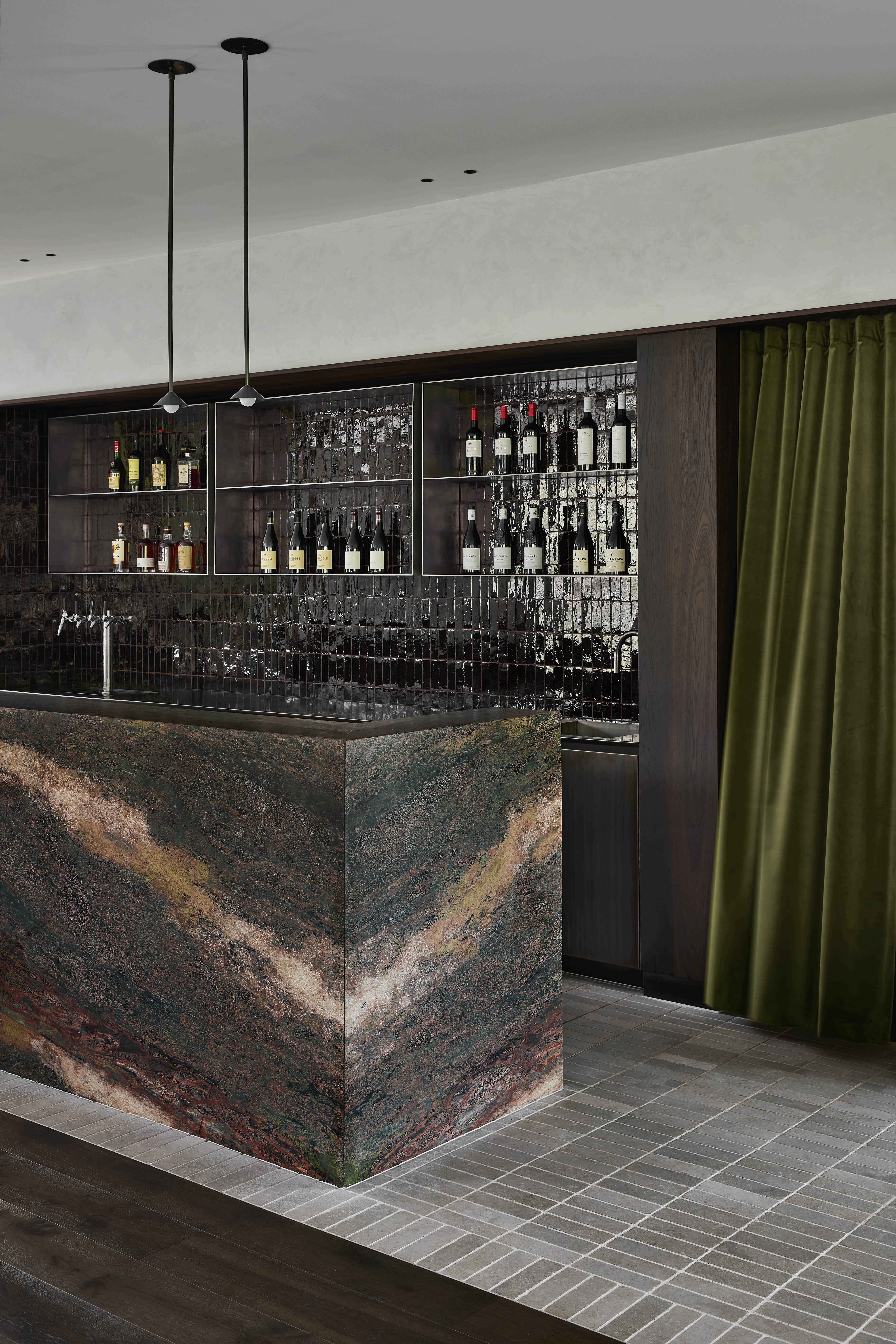 A palette of dark and textural natural materials highlights the exterior landscape, allowing the surrounding greenery to pop. Throughout the renovation of the main restaurant and storage shed, special attention was given to the acoustics of the space. A custom-designed acoustic ceiling grid and green velvet curtains reduce noise and allow spaces of varying functions to coexist.