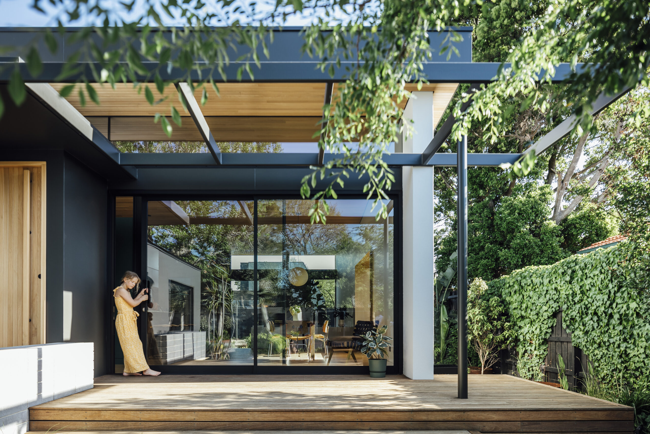 The extension is at natural ground level, three steps below the original floor level, and includes a sunken lounge, the boys’ bedrooms and a games room connected to the pool side deck. The dining area opens to a north facing deck and courtyard at the front of the house, providing outdoor entertaining space well separated from the teenager zone at the back. Referencing the original house, concrete blockwork features inside and out, as well as oak timber which is complemented by soft grey walls, black joinery and colour blocking to highlight key elements.