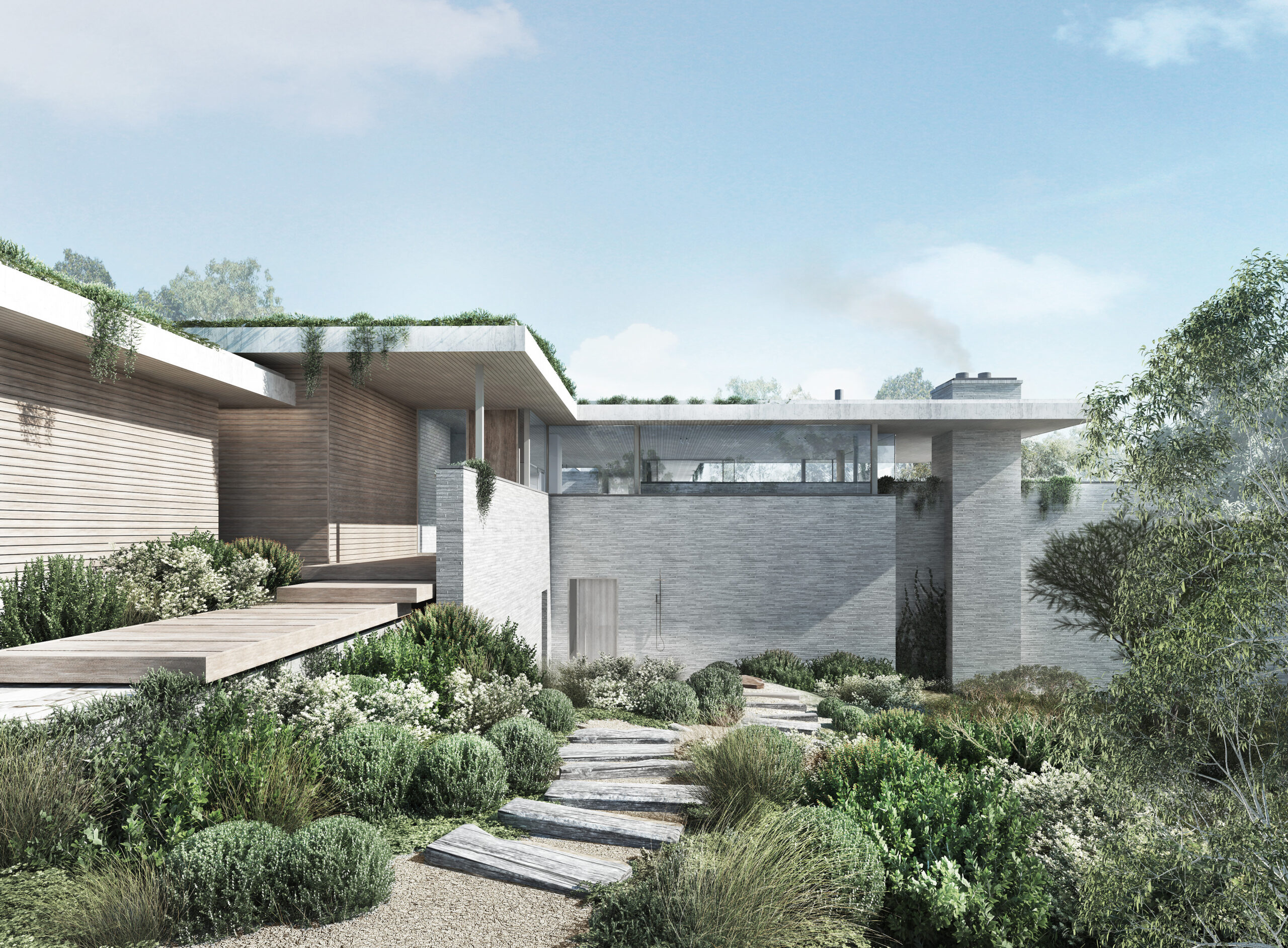 Extensive glazing is juxtaposed by slender clay brick walls that anchor the house and create a secluded garden where outdoor entertaining areas overlook lush landscaping and a circular swimming pool.