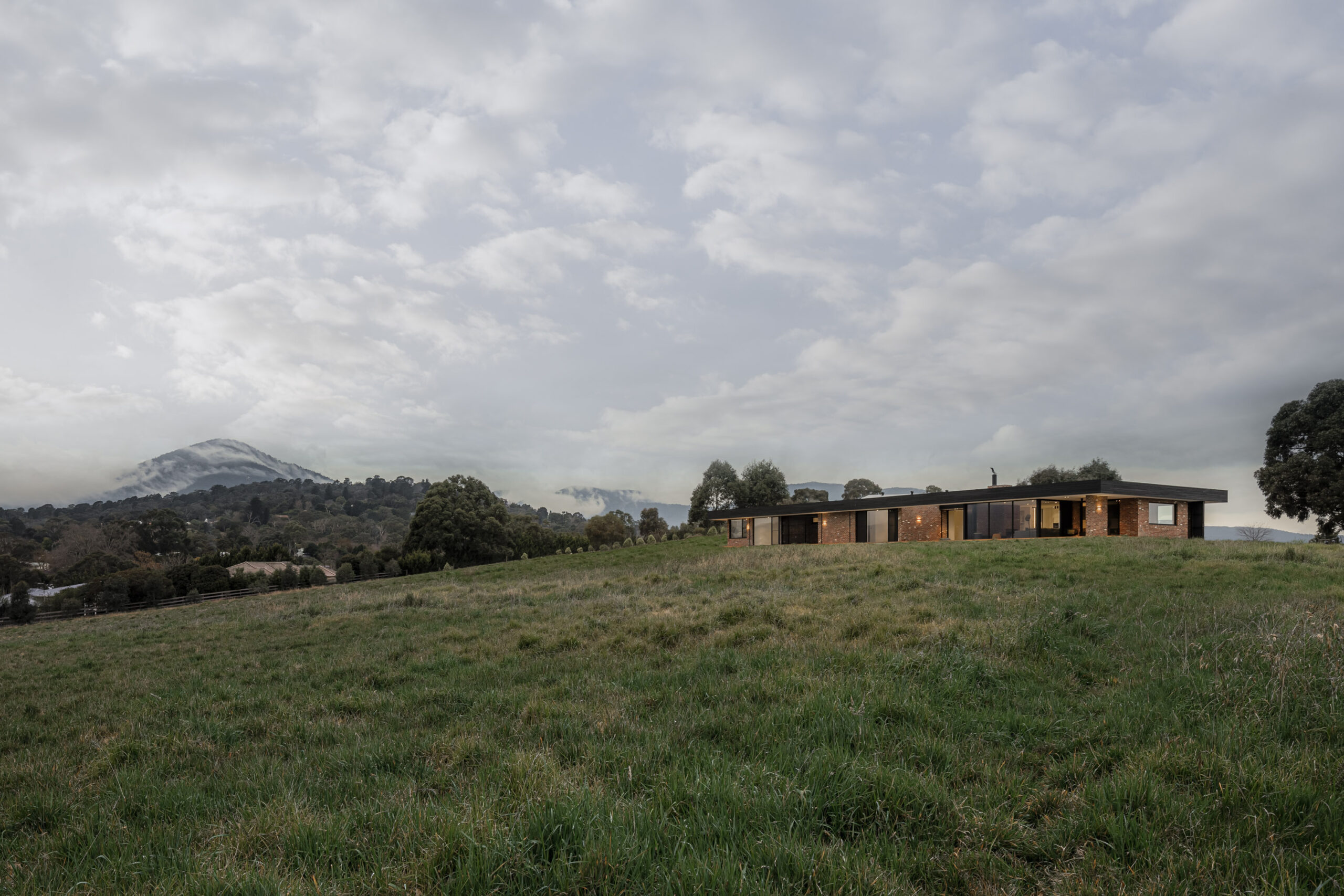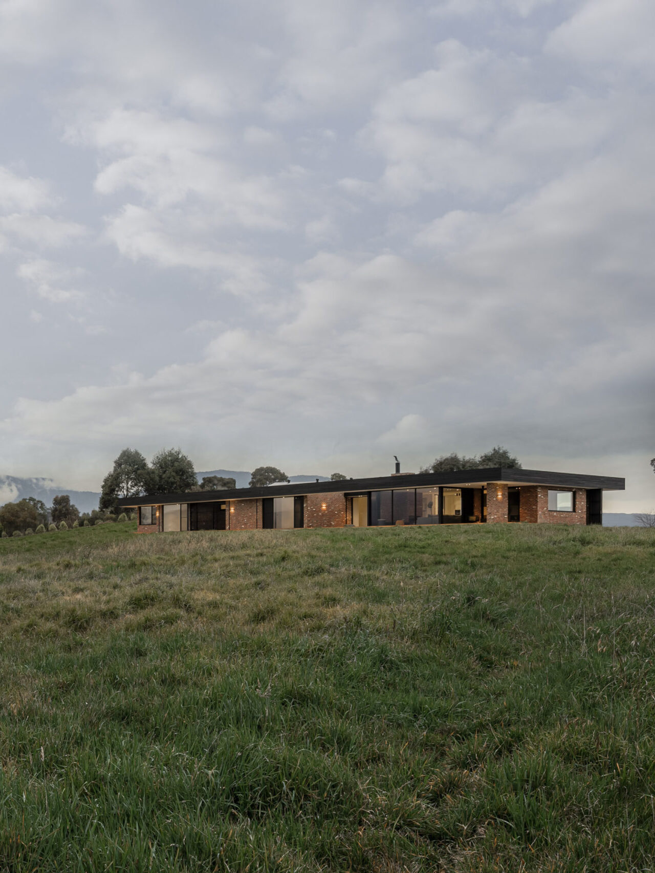 This four-bedroom residence on the outskirts of Healesville has been conceived as a rural pavilion, sitting on top of an undulating paddock with country views towards the Yarra Ranges. The long linear roof extends the entire length of the building, capping reclaimed brick wall panels and extensive glazing that frames views from every room. A black charred timber fascia contrasts the old brickwork, both robust and timeless materials in keeping with the country setting.