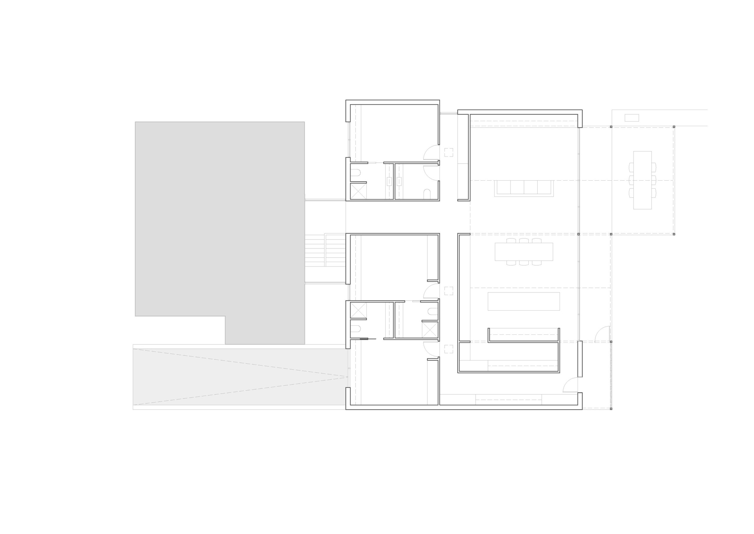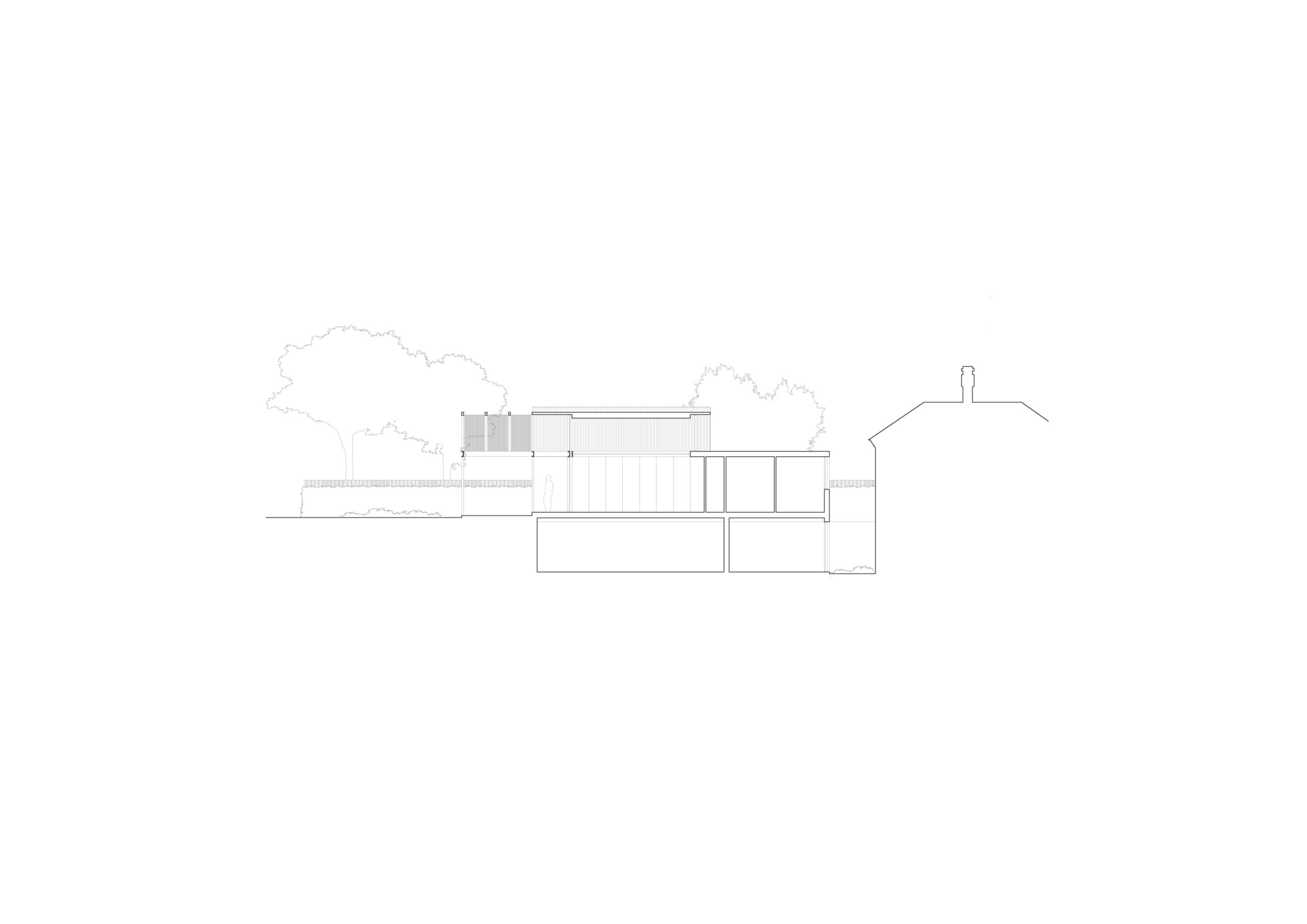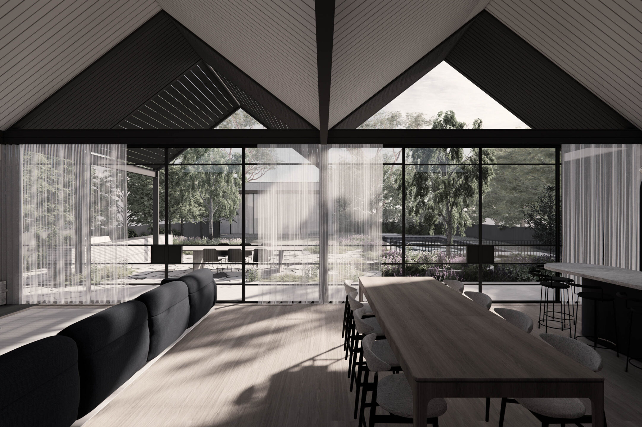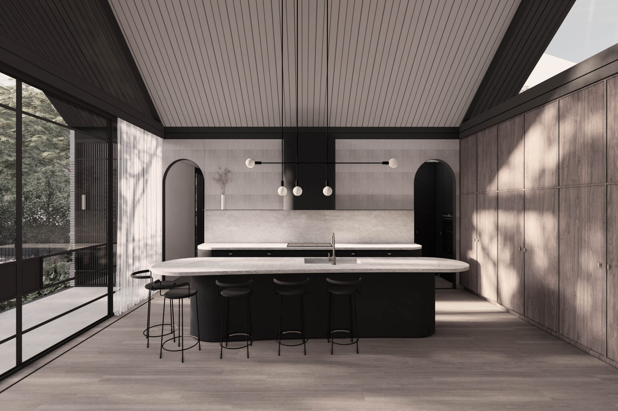 With the main bedroom, study and lounge housed in the existing renovated house, the extension contains three kids’ bedrooms and the main kitchen and living area on the ground floor, with a five-car garage, gym, storage and bathroom in the basement. The sunken courtyard on one side of the link allows light and ventilation into the basement, while on the ground floor, the main kitchen and living area has two gable cathedral ceilings that flood the space with light and sky views. The gable extends over the outdoor entertaining area with an operable roof.