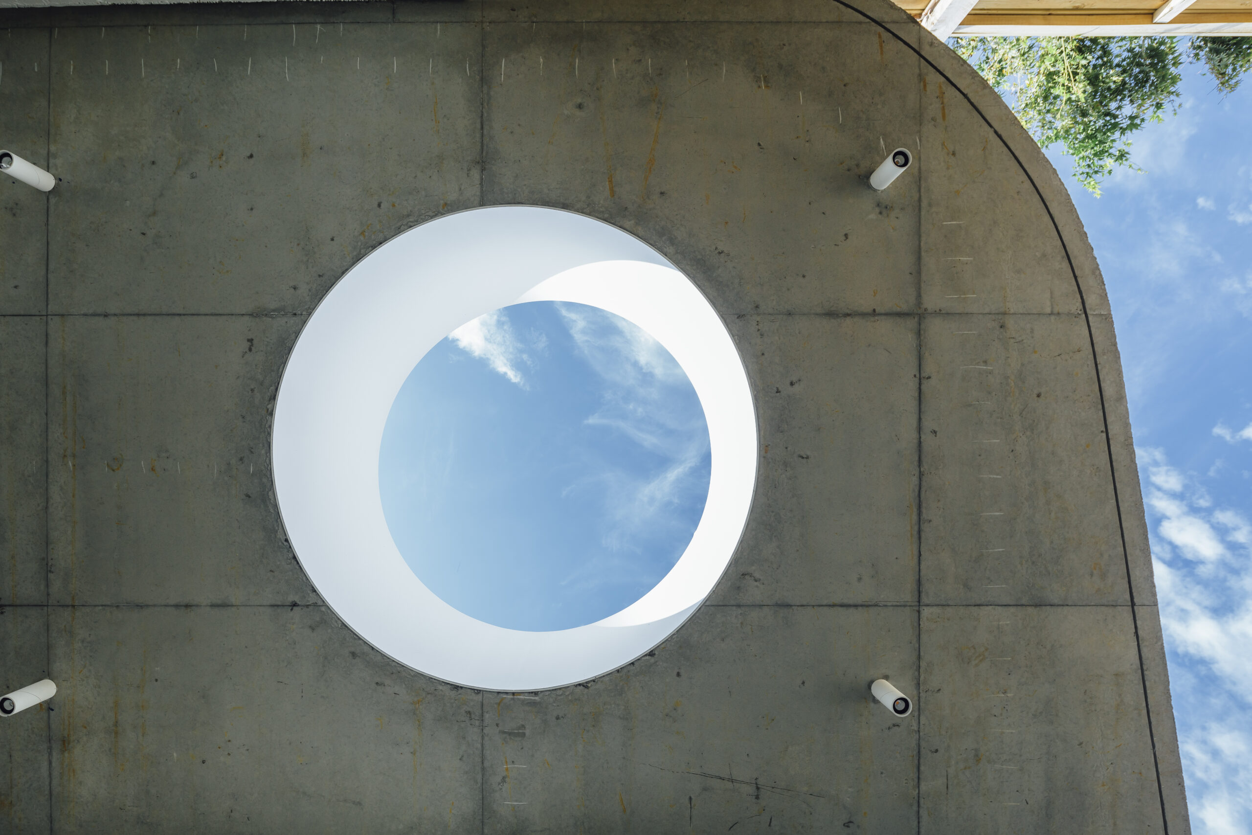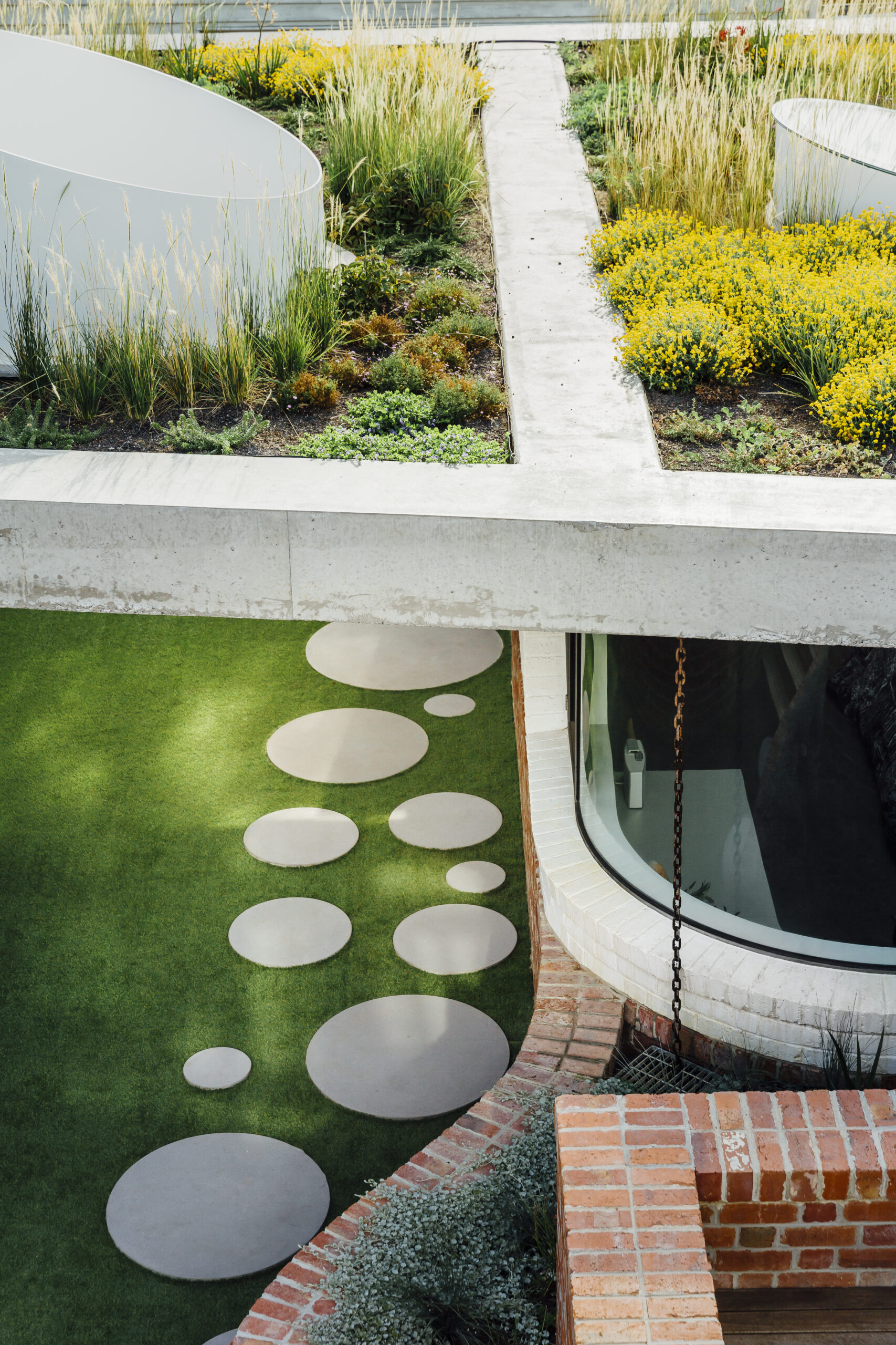 This small studio creates a work space for a professional couple and their kids, while an adjacent terrace provides a car space and outdoor entertainment area next to a new deck. A curved concrete roof, brick wall and custom steel window give the building a surprising softness and provide a potential backdrop for a collection of animal sculptures!
