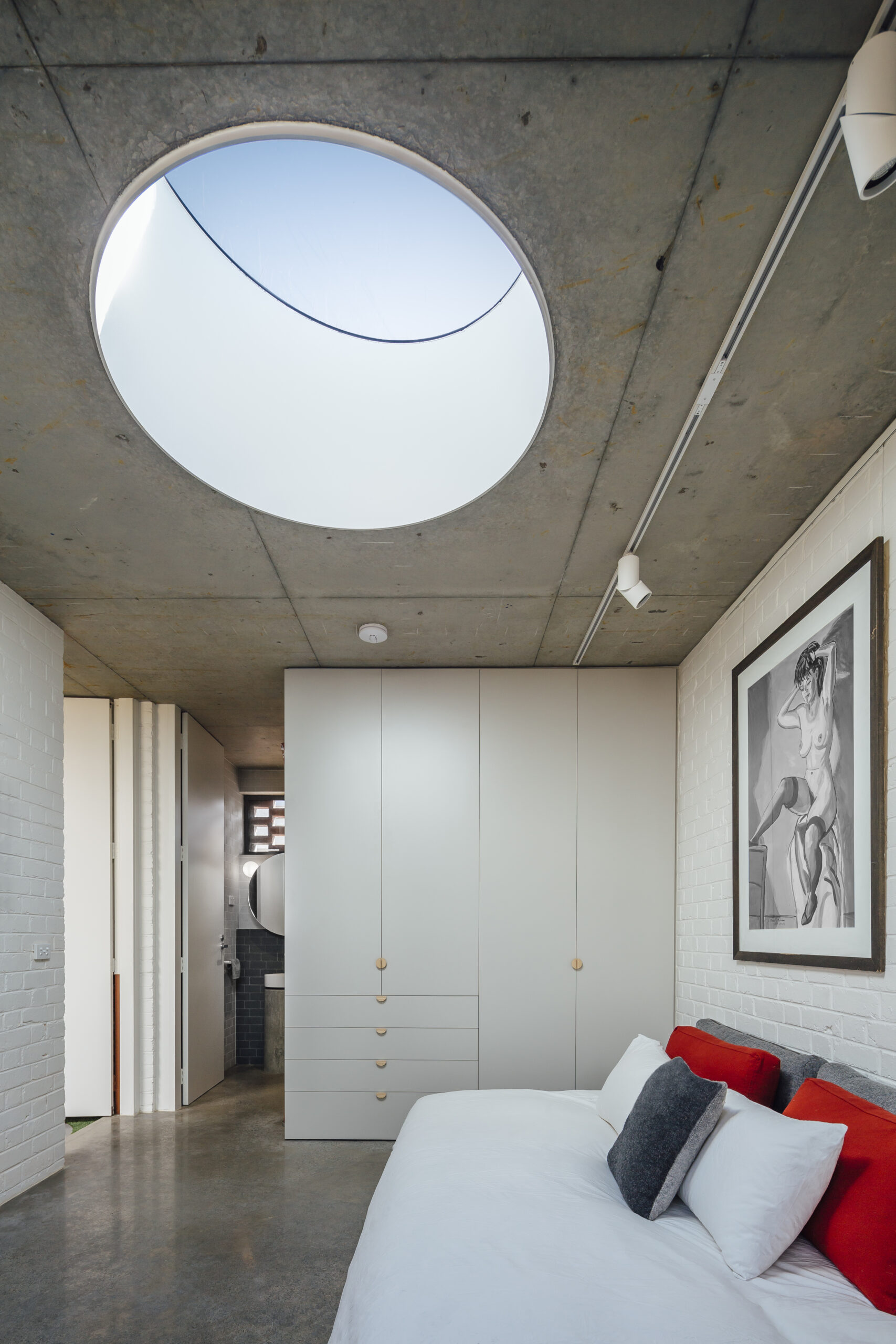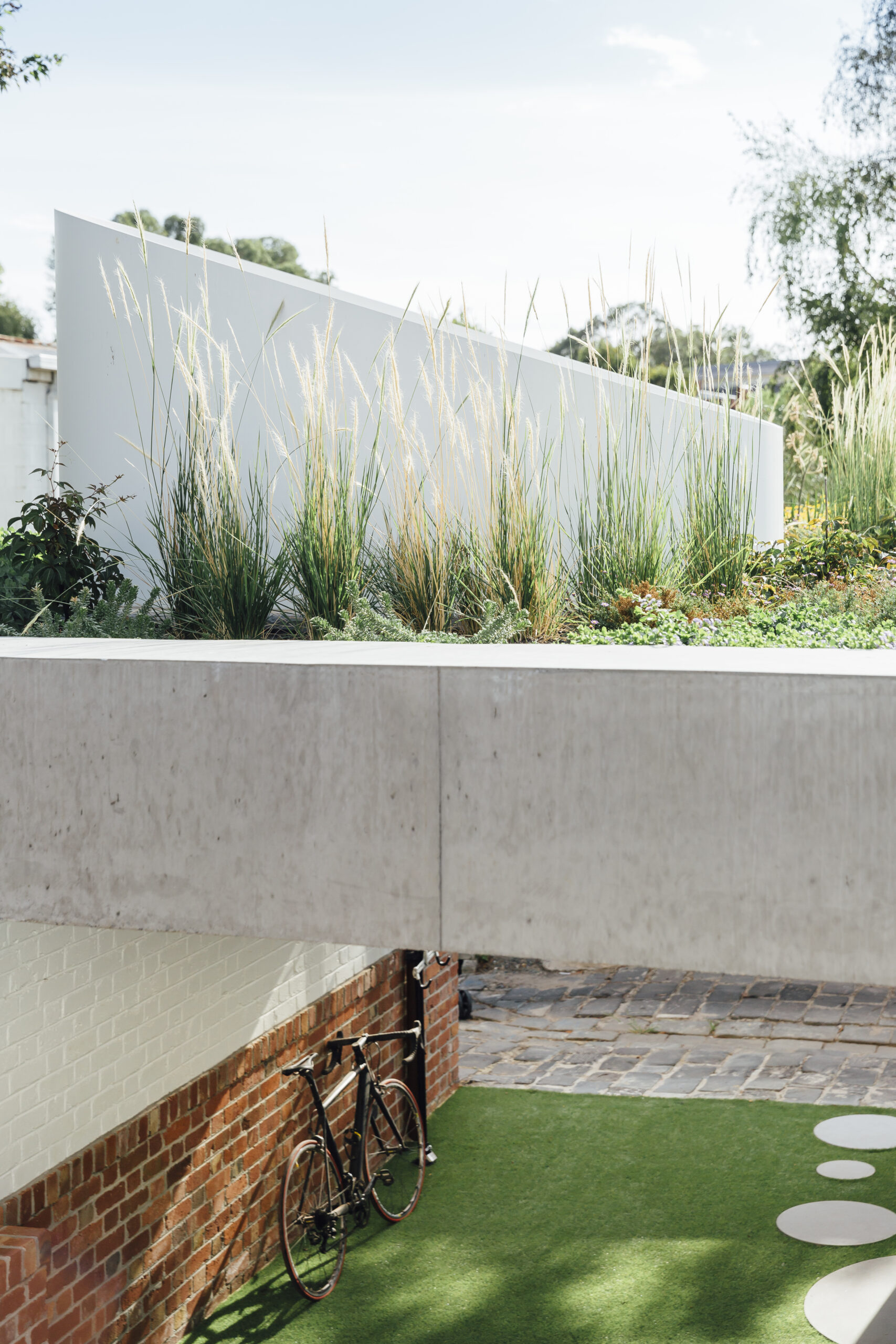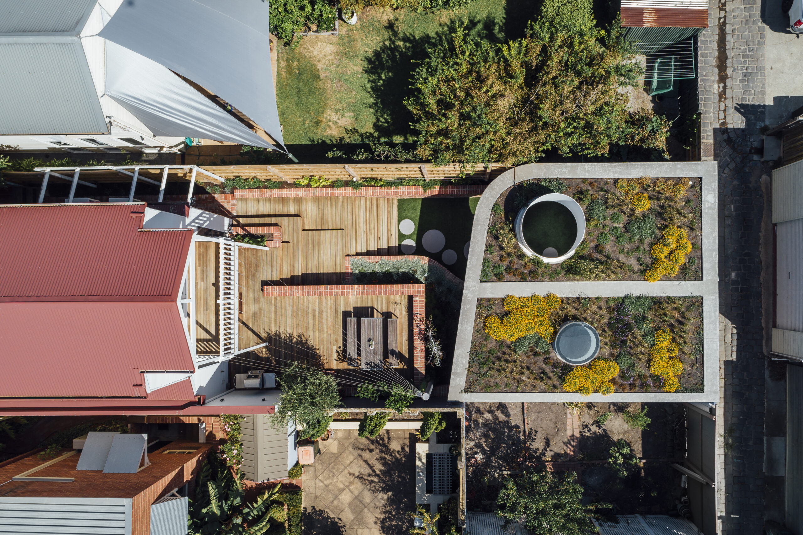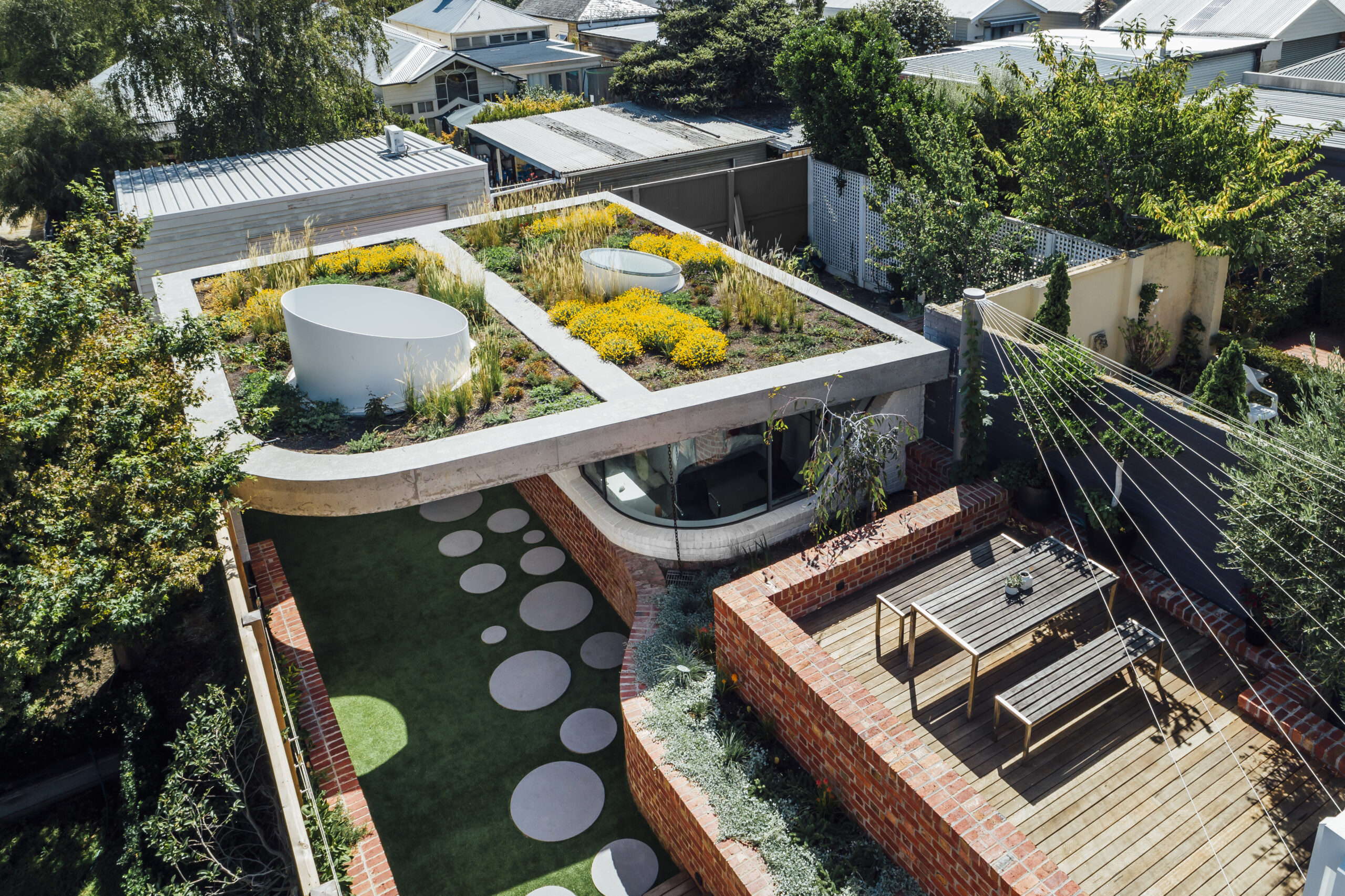 Raw, robust materials including recycled brick, concrete and timber were deliberately chosen to contrast the weatherboard cottage and reflect the vernacular of the adjacent laneway. The project is still waiting for the huge elephant sculpture planned for the roof, but in the meantime the green roof provides a lush view from the main house and deck.