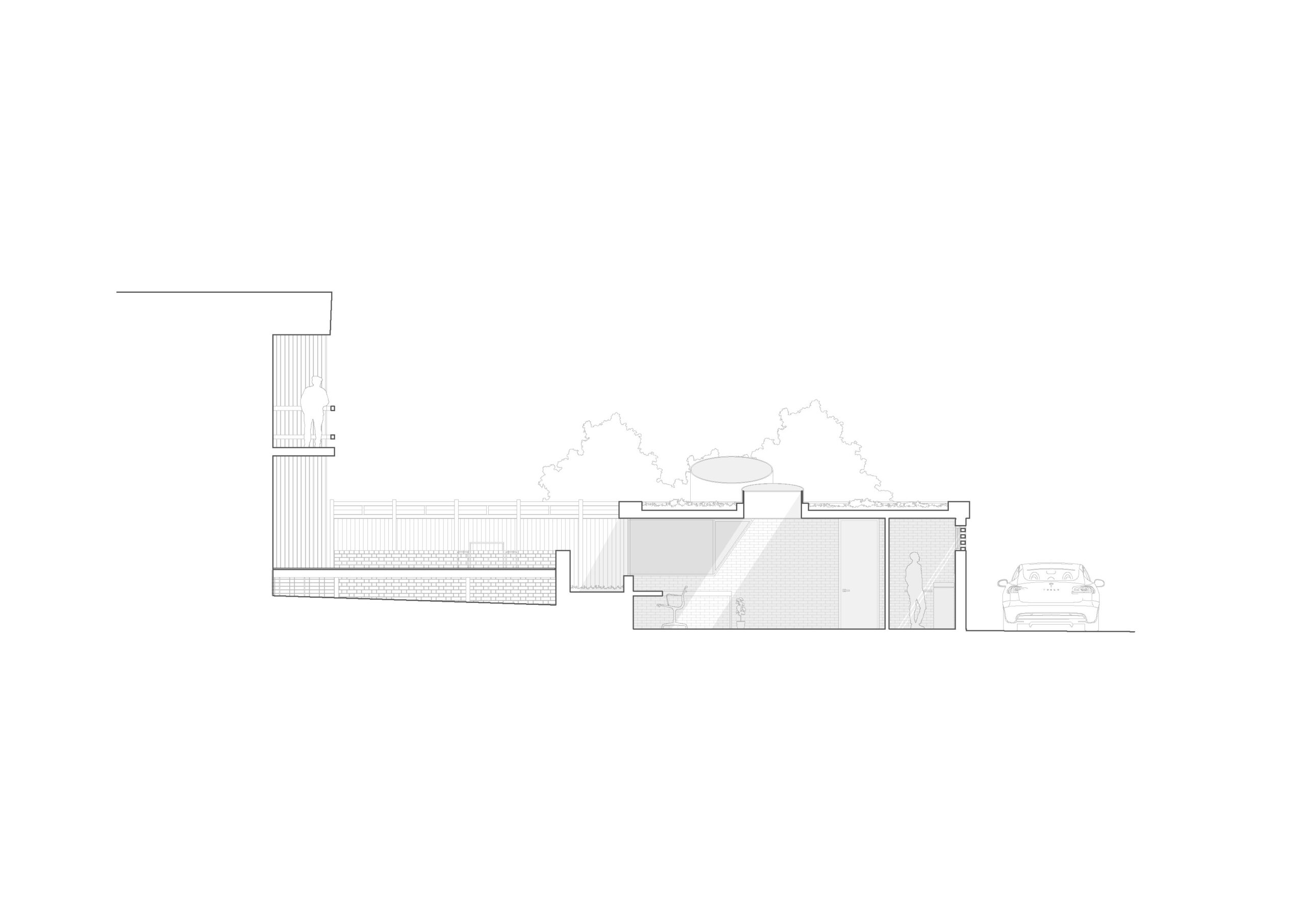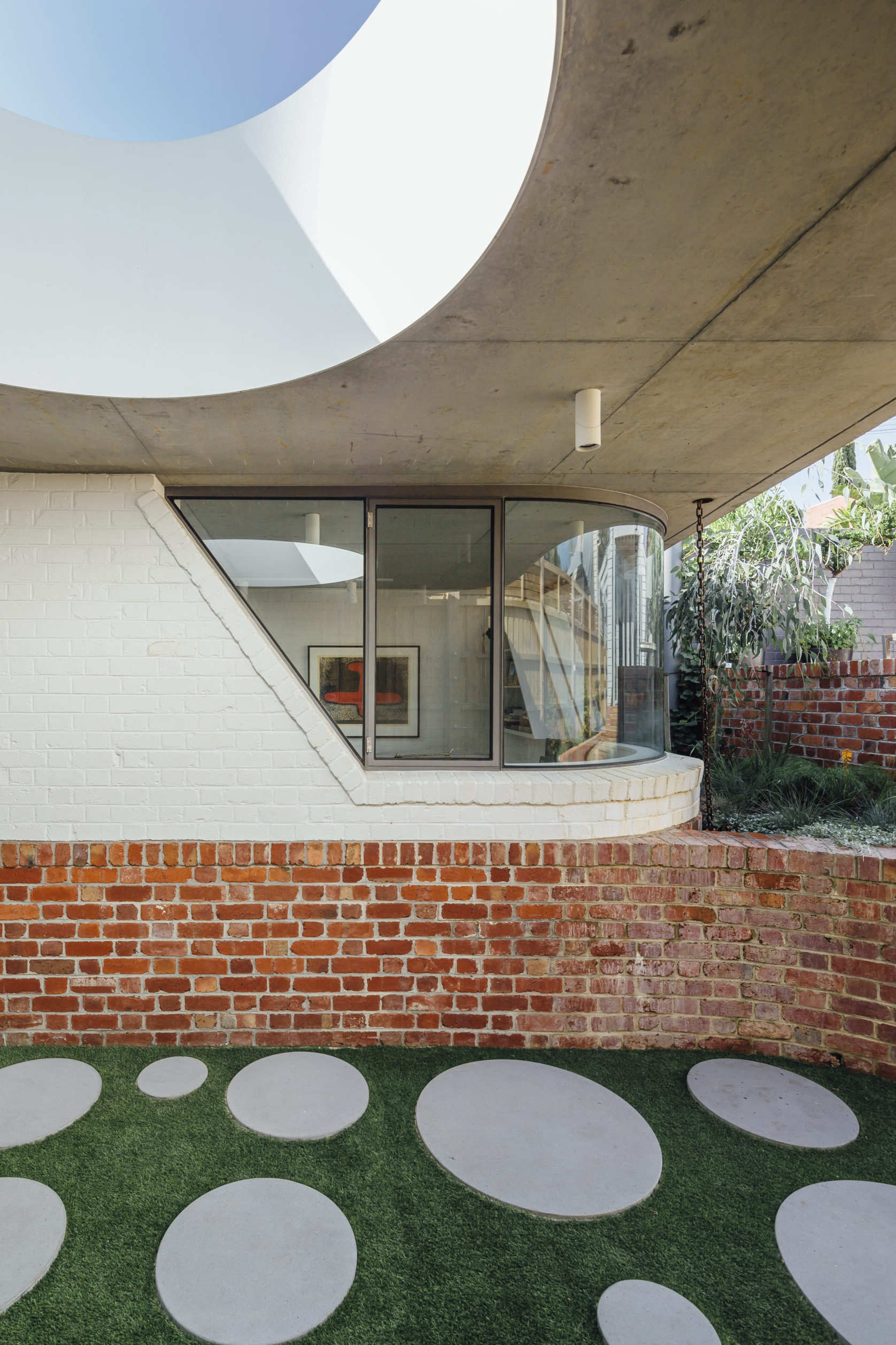 This small studio creates a work space for a professional couple and their kids, while an adjacent terrace provides a car space and outdoor entertainment area next to a new deck. A curved concrete roof, brick wall and custom steel window give the building a surprising softness and provide a potential backdrop for a collection of animal sculptures!