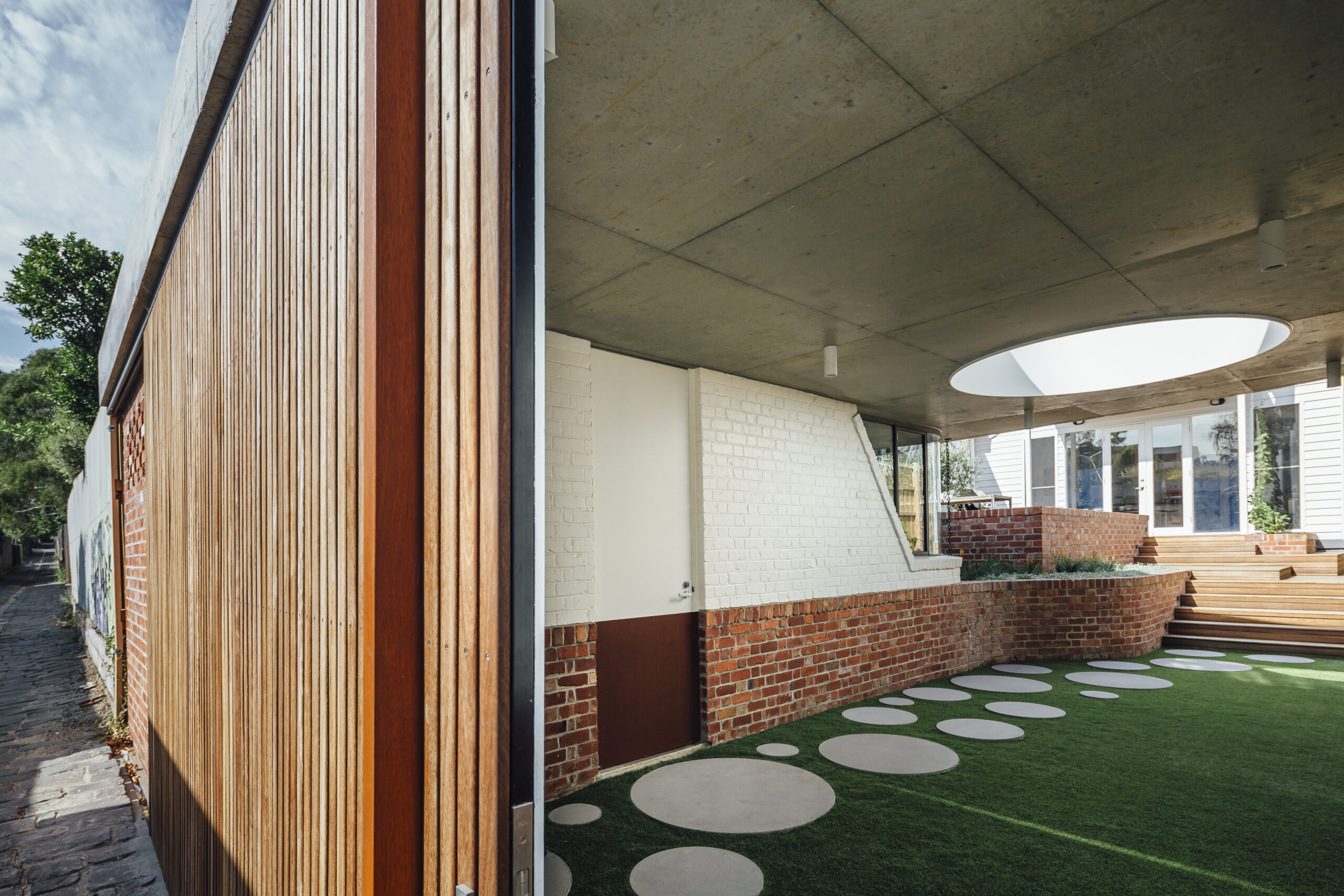 Recycled brick, concrete and timber were deliberately chosen to contrast the weatherboard cottage and reflect the vernacular of the adjacent laneway
