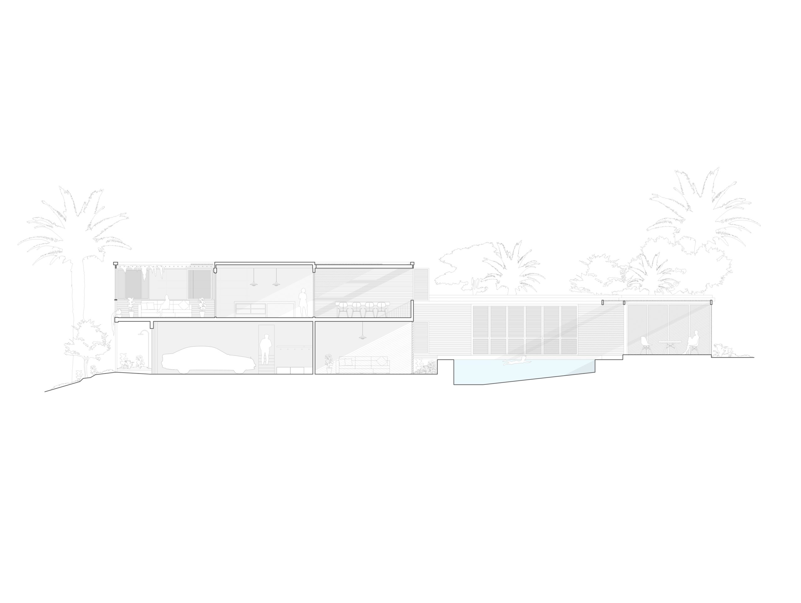 The home presents a strong sense of arrival, enhanced by a dual-access driveway that enables a grand, sweeping entry sequence—invoking a relaxed yet sophisticated Palm Springs aesthetic. The elevated position allows the integration of a semi-subterranean garage and utility zone, maximizing usable site area while maintaining an unobtrusive streetscape presence.