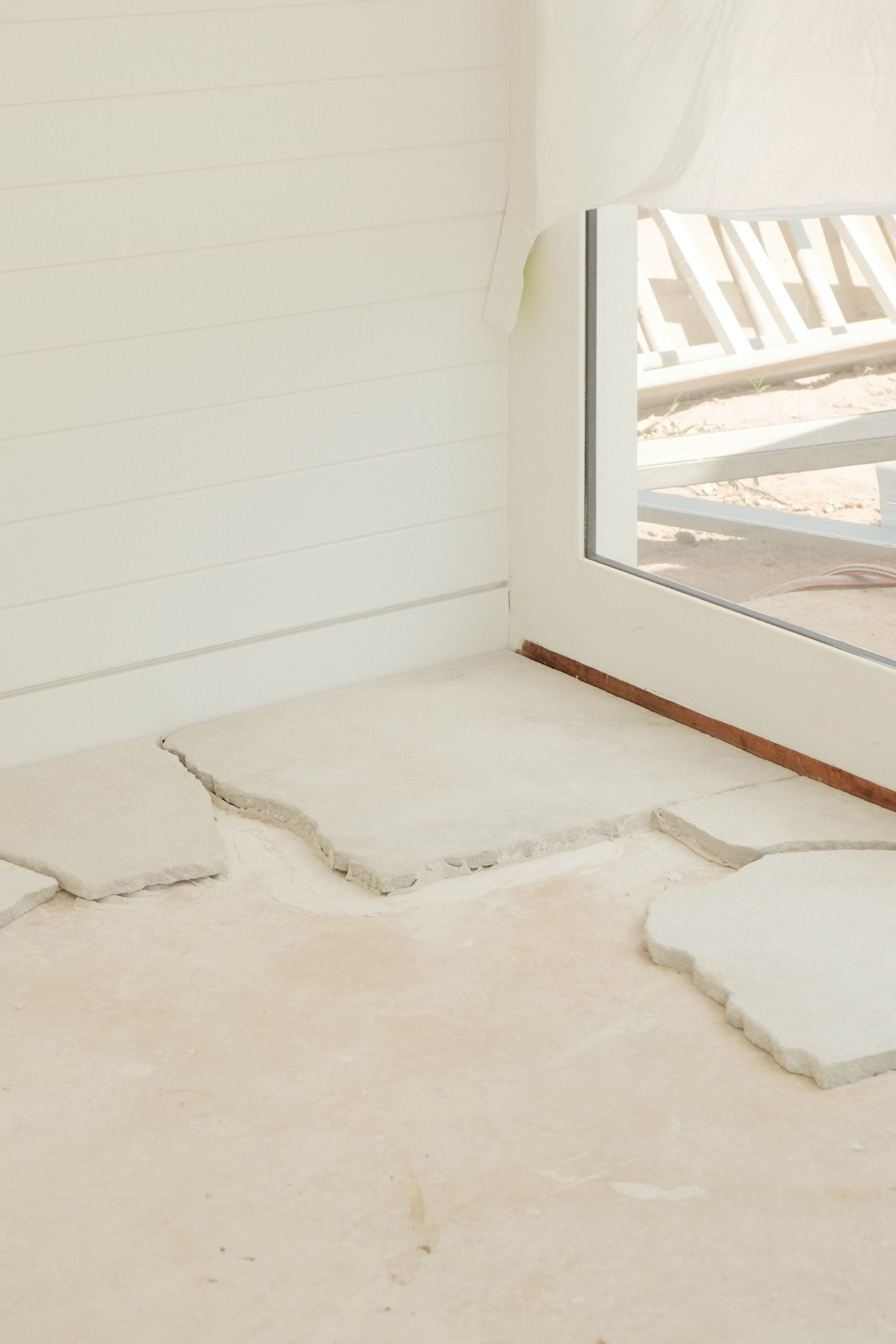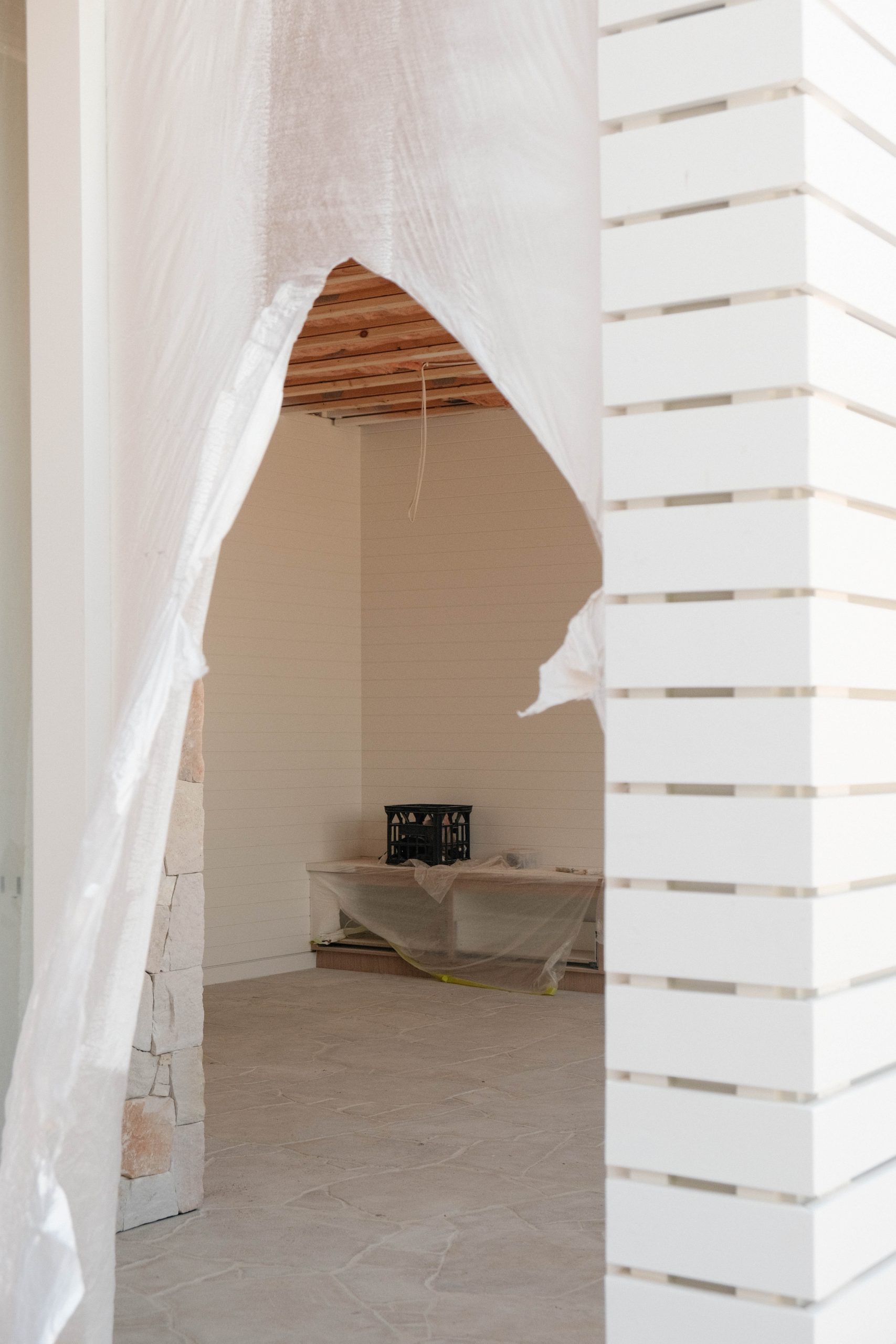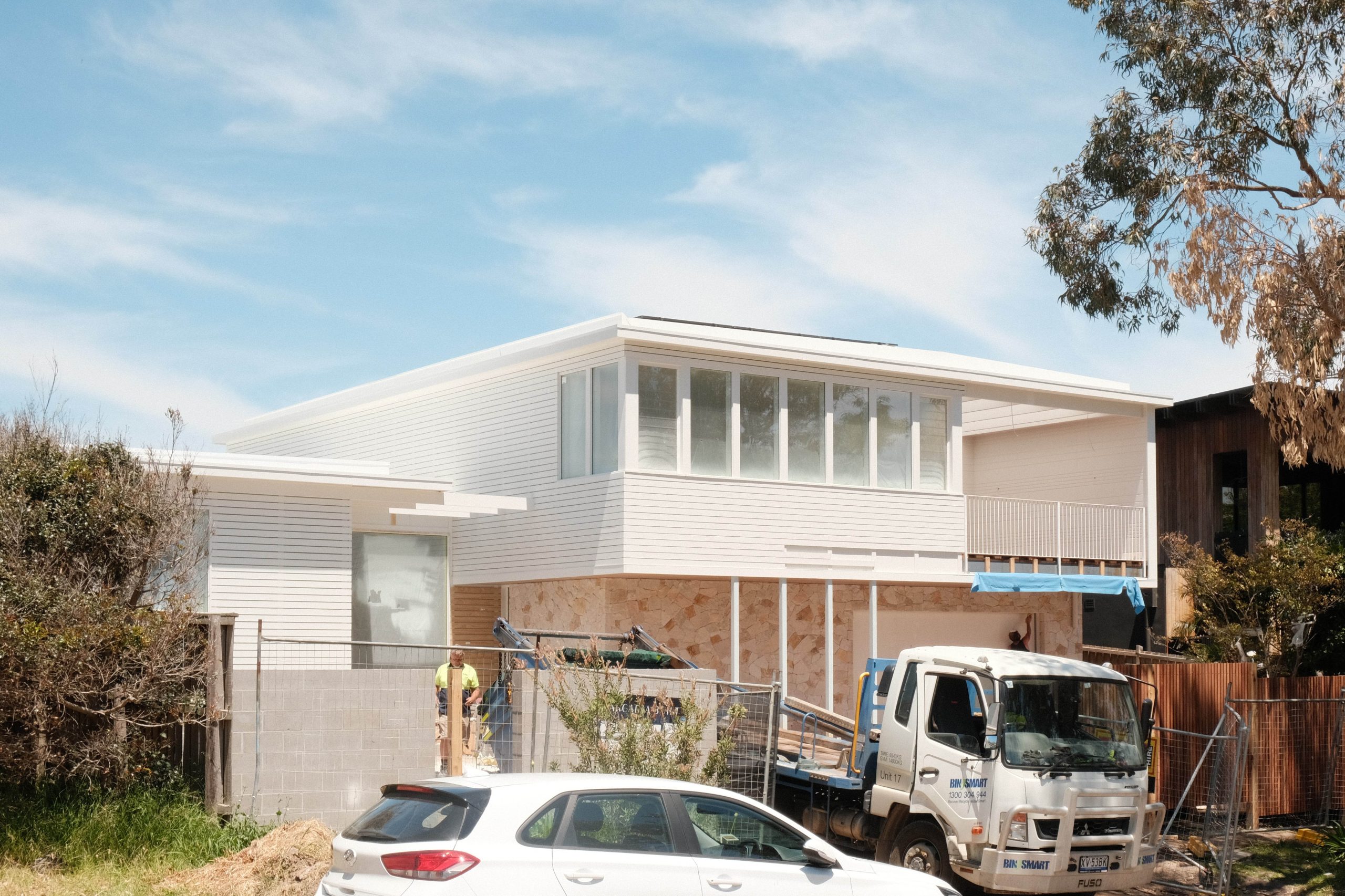 Materiality plays a central role in embedding the home within its coastal context. Lightweight white-painted timber cladding provides a crisp, clean aesthetic, while the lower level is anchored by locally sourced natural stone, grounding the architecture and echoing the earthy tones of the surrounding landscape.