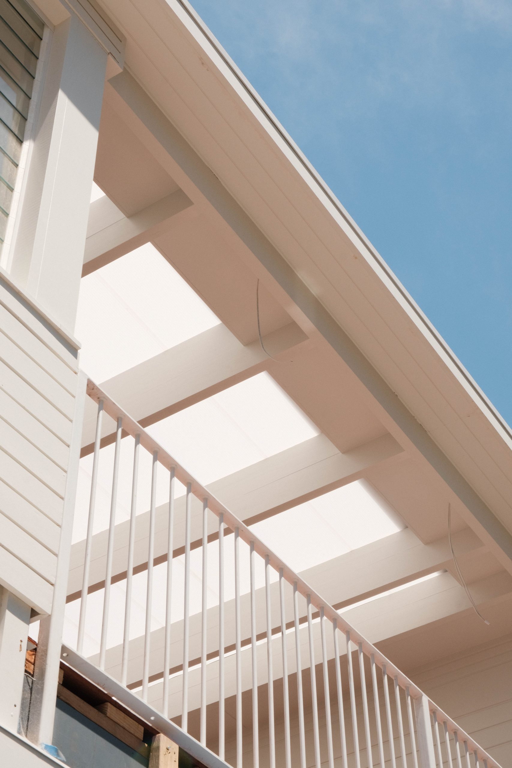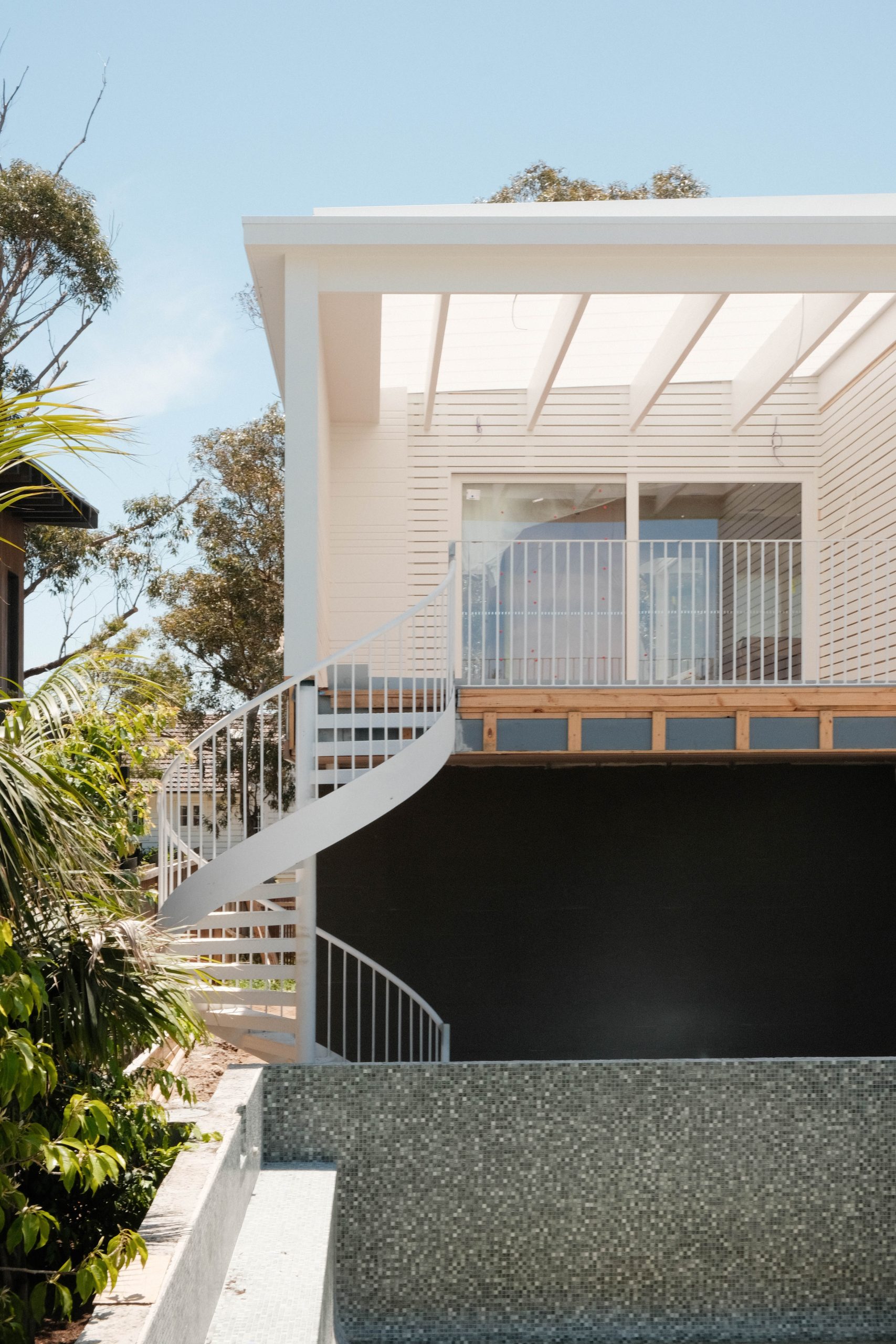 Passive design strategies are fundamental to the home’s environmental performance. Expansive north-facing glazing captures natural light and warmth throughout the year, while operable louvered windows harness the cooling southern sea breezes during summer months. External white timber shutters and pergolas serve as both functional and aesthetic elements, allowing the home to be opened or shaded as required—enhancing natural ventilation and solar control.