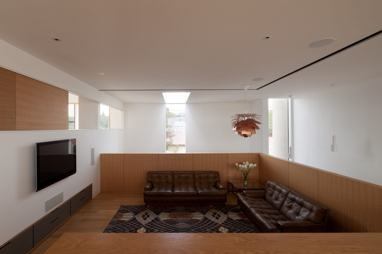 Entry to the house is directly off the street into a 7m high space featuring a Japanese Maple and a full height north facing window that illuminates the interior. The first floor study has internal views over the soaring entry space, as well as the street below via a deep bay window seat, while the private master suite with rooftop views is accessible via a discrete staircase behind the kitchen. Internal materials include polished concrete, timber and white walls providing a refined backdrop to an interior defined by voluminous spaces, dynamic light and intriguing views.
