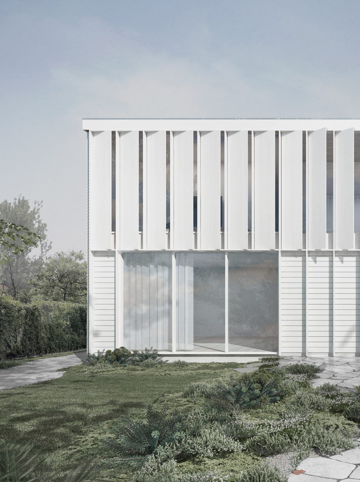 In this four-bedroom coastal holiday home, two storeys at the front are juxtaposed by a predominantly glazed pavilion to the rear. Connected by an informal entry and a north facing courtyard, a series of operable panels animates the west-facing front facade, providing sun protection and shelter from prevailing sea breezes.