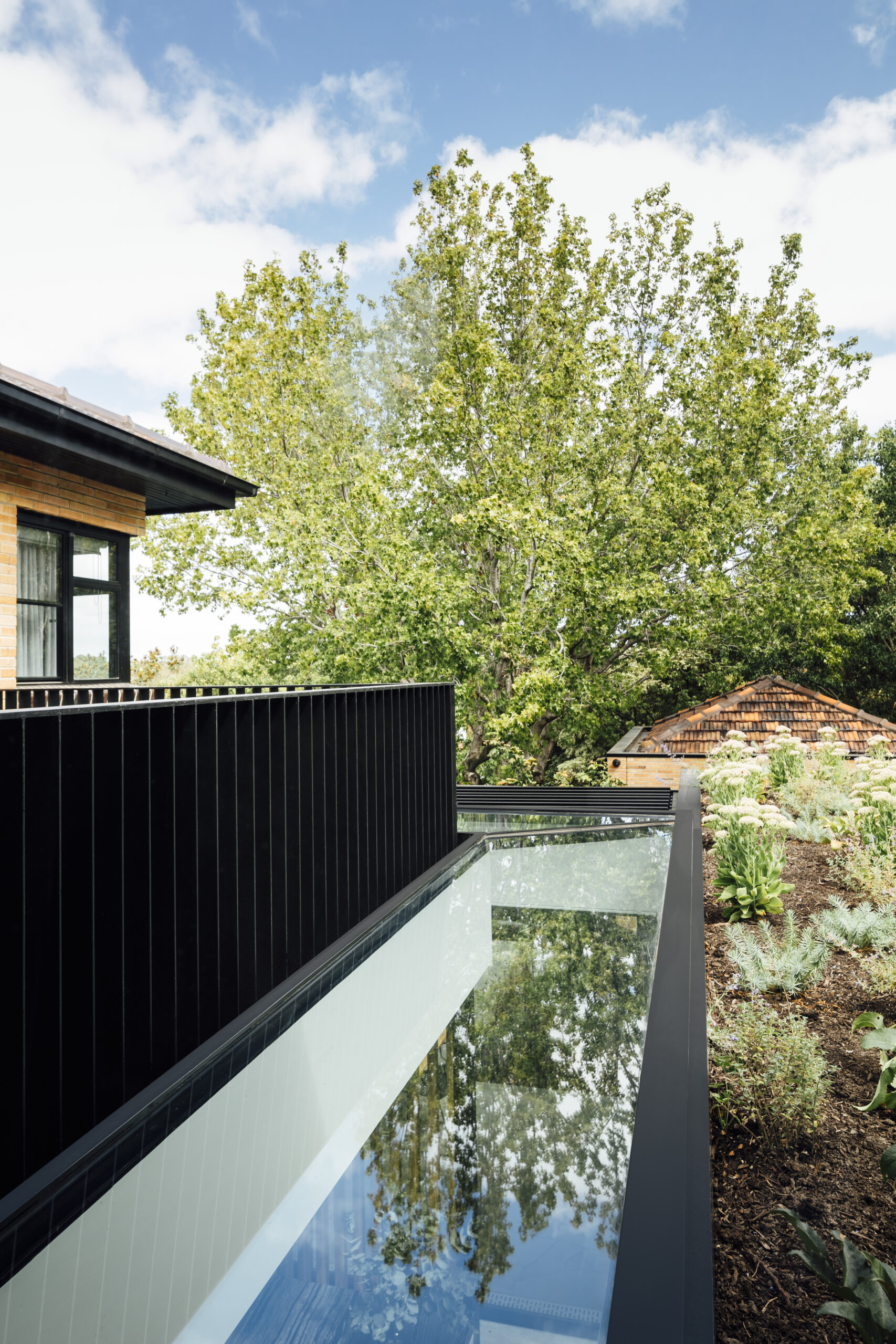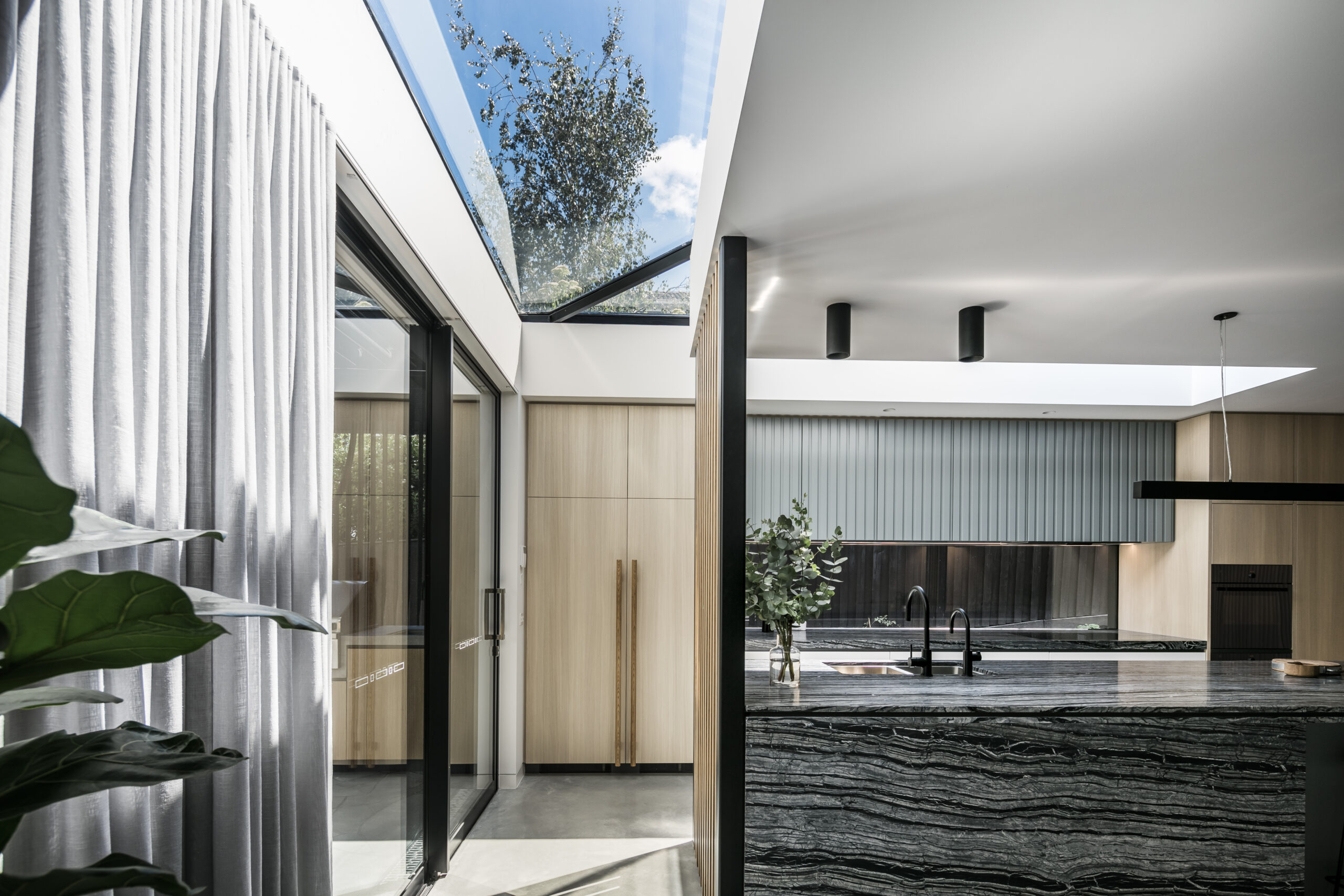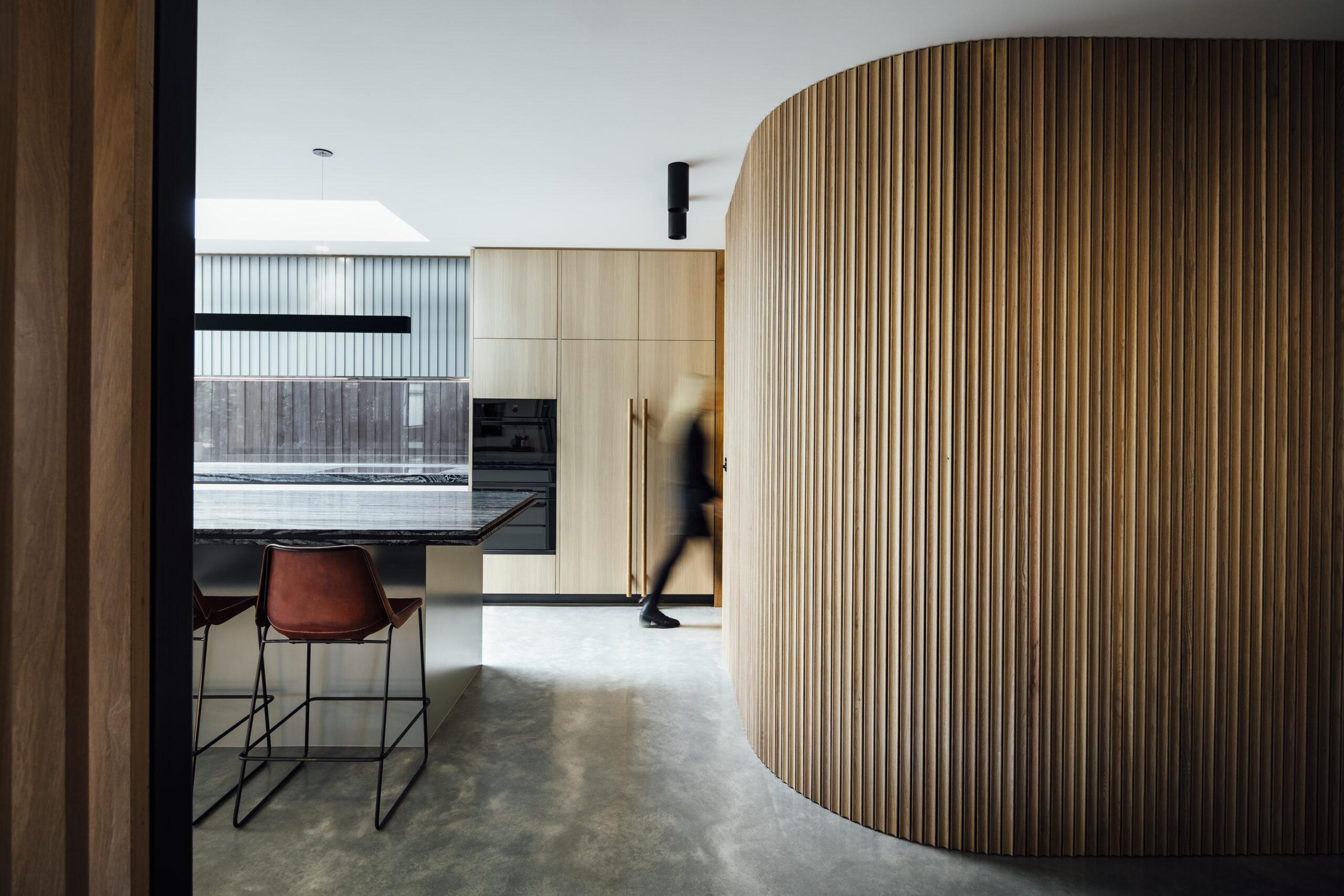 A large feature skylight articulates the kitchen and bathes it in light, while a steel finned façade delineates the lower floor extension that softens in shape to form a fence, separating the garden and driveway. The verticality and curves in the screen are a recurring theme throughout the interior, including delicate, crafted timber screens and walls that enhance spatial flow and light. Tree top views from the upper floor are enhanced by a roof garden with an adjacent deck for added refuge.