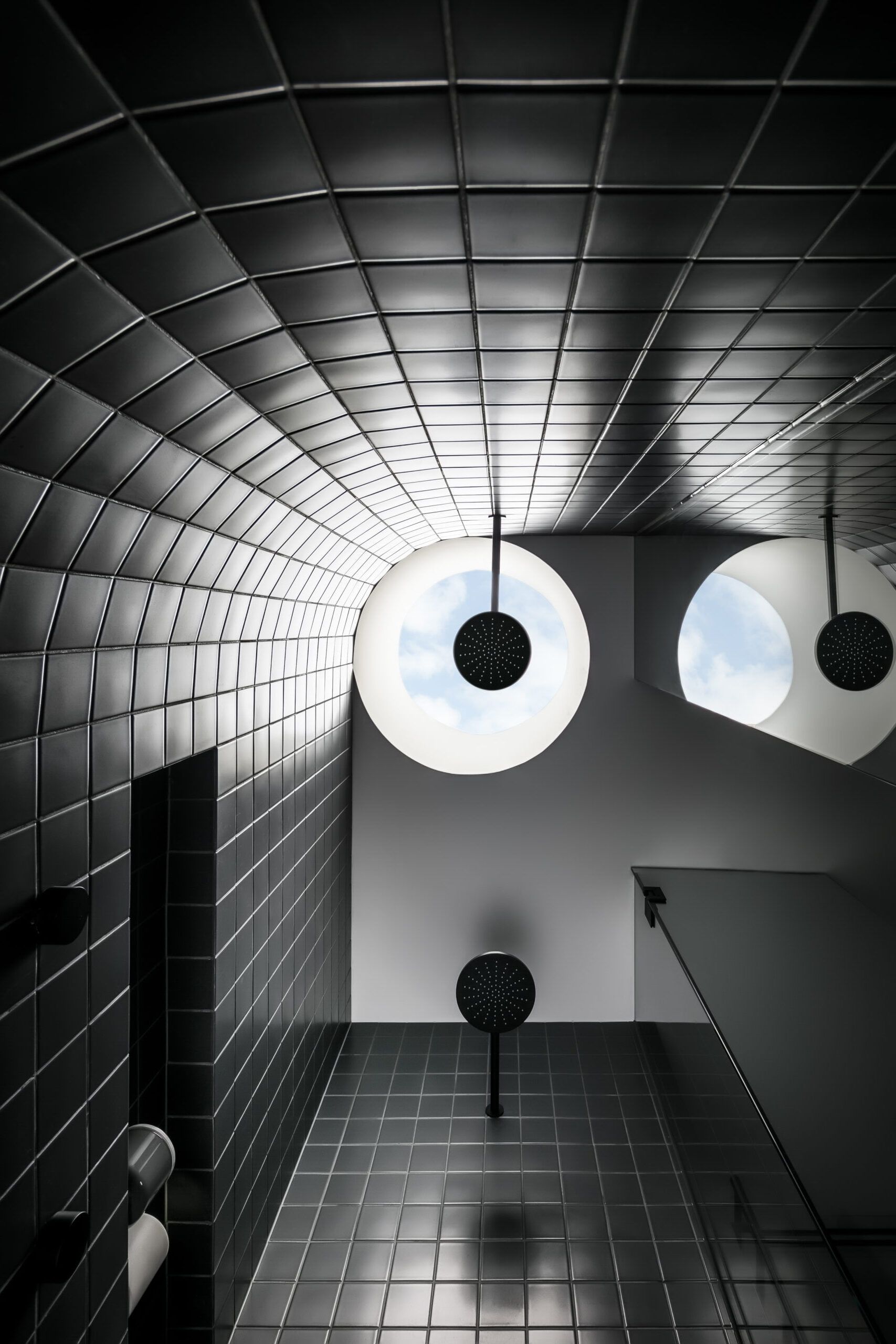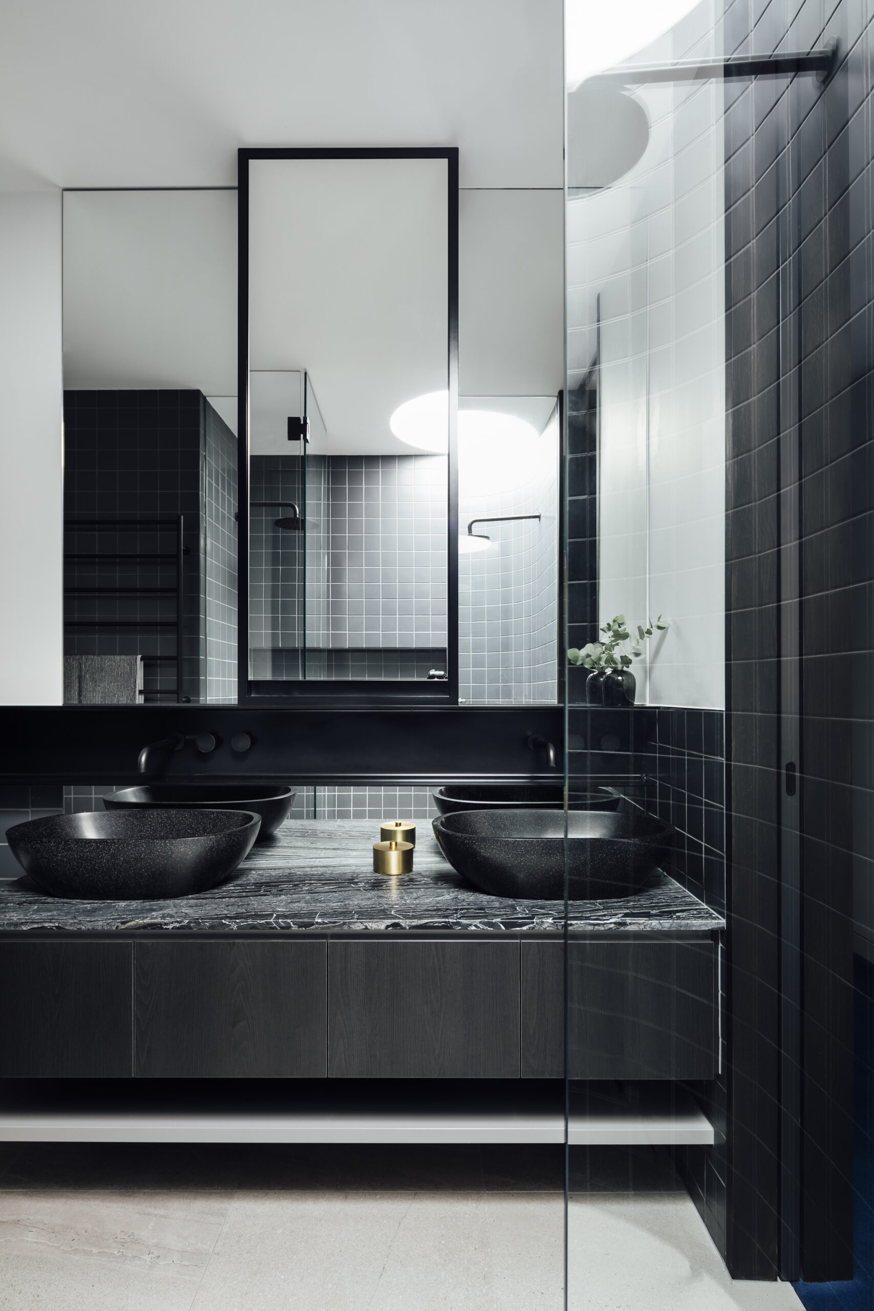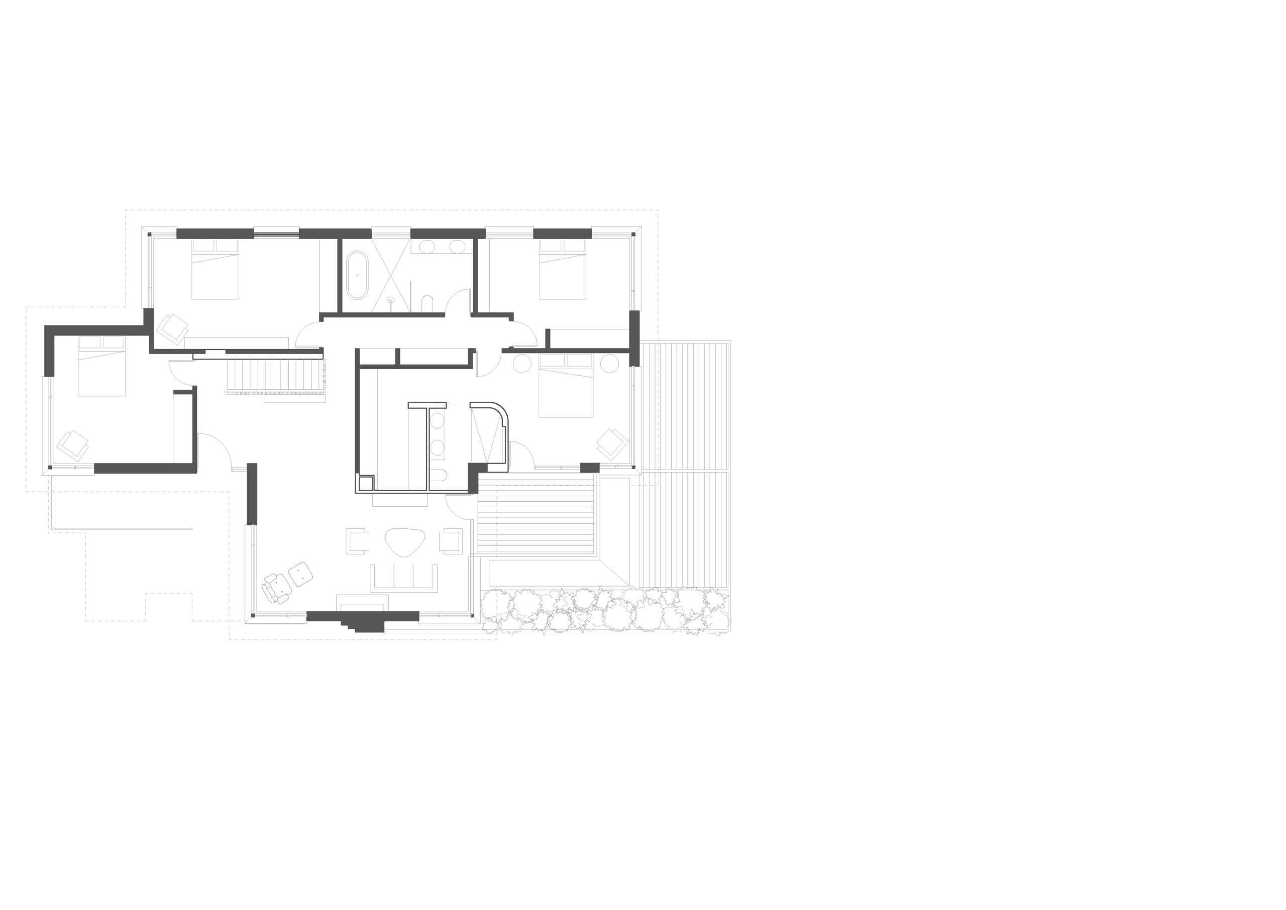 A large feature skylight articulates the kitchen and bathes it in light, while a steel finned façade delineates the lower floor extension that softens in shape to form a fence, separating the garden and driveway. The verticality and curves in the screen are a recurring theme throughout the interior, including delicate, crafted timber screens and walls that enhance spatial flow and light. Tree top views from the upper floor are enhanced by a roof garden with an adjacent deck for added refuge.